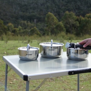 Each pot is designed to sit neatly within the next. This feature turns three pots into one compactunit, saving you valuable space in your cupboards, or vehicle. With a removable / interchangeablehandle you also save space on your cook top.