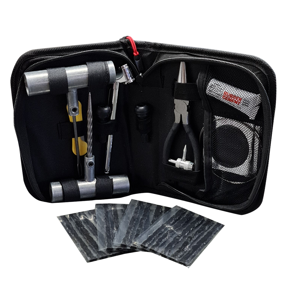 Included 30 Self Vulcanizing Plugs | Rugged Aluminium Hand Tools | Folding Knife | Lubricant | Pair of Needle Nose Pliers | Extra Valve Stems | Dual Head Tyre