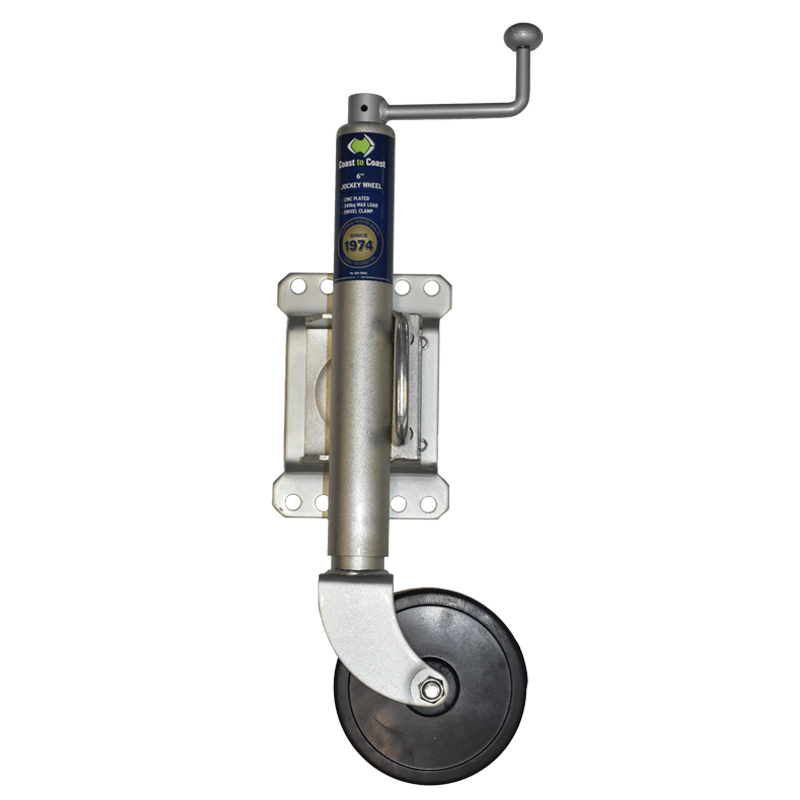 Coast 6" 340kg Jockey Wheel + Swivel Clamp - BD-03A2, 1 Year Warranty. Coast to Coast's new range of quality jockey wheels is now available. Perfectly suited for most caravan, trailer and horse float applications, this new range has all of your jockey wheel needs sorted.
