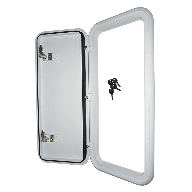 Coast Access Door 6, 288 x 653 mm, Black or White Option, 1 Year Warranty. Utilise the cavities in your RV body to create much needed storage space and use the Coast Doors to access them. Available in eight handy sizes, the Coast Doors are available in white with a smooth and modern finish. Installation has been streamlined – screw holes are pre-drilled and they are supplied as a complete door, meaning there is no need to infill. It features an effective door seal and comes with keys to lock and reopen.