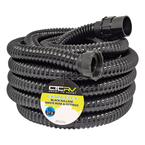 Coast RV 10m Roll Black Extra-Flex Sullage Waste Hose with 40mm Fittings, 27mm I.D., 1 Year Warranty. COAST RV Black Sullage Waste Hoses are designed for caravan enthusiasts seeking top-tier performance and excellent value. Available in 5m and 10m lengths, these hoses ensure efficient drainage of grey wastewater from your kitchen sinks and showers.