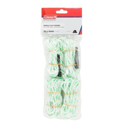 Coleman Single Guy Ropes, 1 Year Warranty. The glowing feature increases the visibility of your tent in the dark and ensures that you don't trip over the guy rope. Ideal for fastening and securing tarps and canopies. 4 pack of 3m x 6mm. Suitable for tents, Tarps, awning and Poles Easy to use. Plastic guy rope grip.