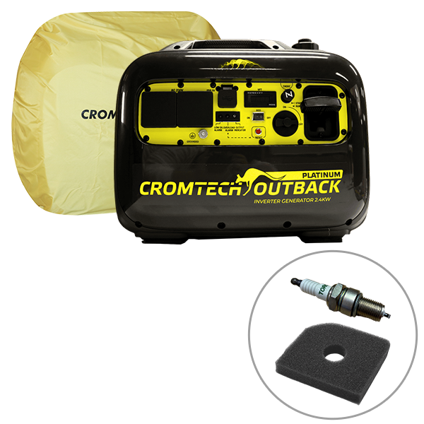 Cromtech Outback Platinum 2400W Inverter Generator, 2 Year Warranty. Are you in search of a portable, quiet and compact generator for camping? Introducing the Cromtech Outback Platnium 2400 watt portable inverter petrol generator, a super quiet, compact unit ideal for camping, caravanning and home backup power use.