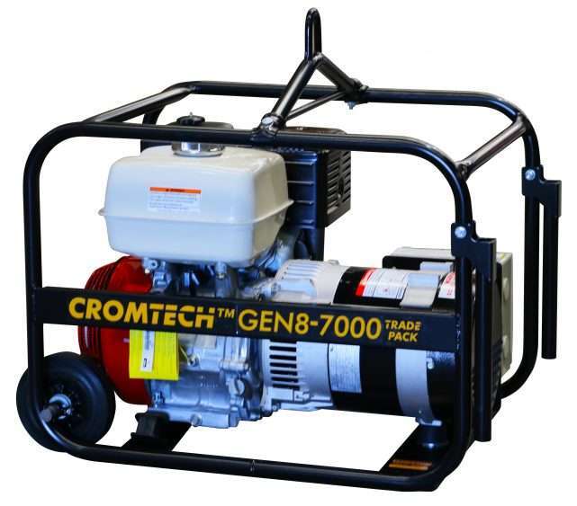 Crommelins Cromtech 6.4kVA Worksite Approved Honda Powered Generator, 2 year warranty. The Trade Pack CROMTECHâ„¢ GEN8-7000 Petrol Generator, is design for trades people that need a high quality, simple, no fuss unit.