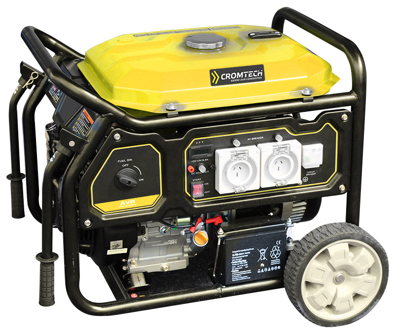 Cromtech 6kVA AVR Petrol Generator, 1 Year Warranty. Designed for general use, this 6kVA AVR electric start generator is perfect for onsite power for tradies. It is also suitable for residential, farms and fetes. The model comes with wheels and fold-out handles to make it easily portable around the site.