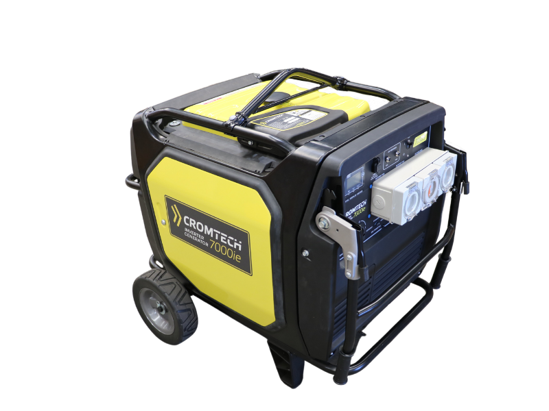 Cromtech TG7000iE 7000w Inverter Generator with Hire Pack, 1 Year Warranty. The Cromtech Inverter Generator 7000ie is powerful yet quiet. It is ideal for use with food trucks, coffee vans, events, emergency home back-up power. Introducing Cromtechs newest member of the Cromtech family- the Cromtech Inverter Generator 7000ie.This generator is powerful with a maximum output of 7000 Watts continuous output of 6000 Watts.