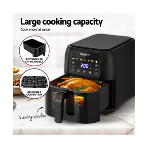 Devanti 8L LCD Air Fryer, 1 Year Warranty. Enjoy your favourite fried foods without guilt thanks to the Devanti 8L Air Fryer. With its smooth and stunning sleek exterior, the Devanti Air Fryer turns ordinary food into extraordinary dishes thanks to their exceptional cooking abilities. With its innovative air frying technology and 1700W of power, you can cook quickly and efficiently. The 8L capacity and 7 cooking presets are suitable for a full set of meals from sides to mains. Better still, all this wonderful cooking is done without a drop of oil and is as delicious and succulent as your favourite fried treats. Foods cooked in our air fryer have up to 80% less fat than regular deep-fried foods. Choose the time, temperature and cooking preset with the easy-to-use LCD touch control panel. The tempered glass viewing window makes it easy to check your cooking progress. The interior features a non-stick pan for easy cleaning, a rectangular frying basket and a removable crisper tray for the ultimate crispy, crunchy experience. It also features an automatic shut-off switch, a cool touch handle, a heat shield vent, and non-slip feet for safety. Most importantly, the components are all dishwasher-safe, making cleaning as easy as pie. Get yours today and see the benefits of fat-free cooking!