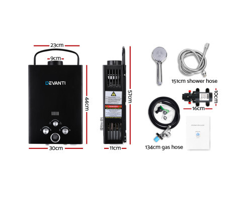 Devanti Black Outdoor Gas Hot Water Heater with 12V Water Pump, 1 Year Warranty. Who doesn't like a just-right warm water shower anywhere, anytime? The Devanti Gas Water Heater is all you need for that instant shower gratification.
