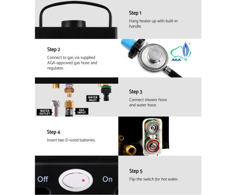Lightweight and portable, the water heater comes with a handy handle and all the required mounting brackets for a hassle-free set-up. Enjoy the open country. And enjoy your warm showers too with the Devanti gas water heater.