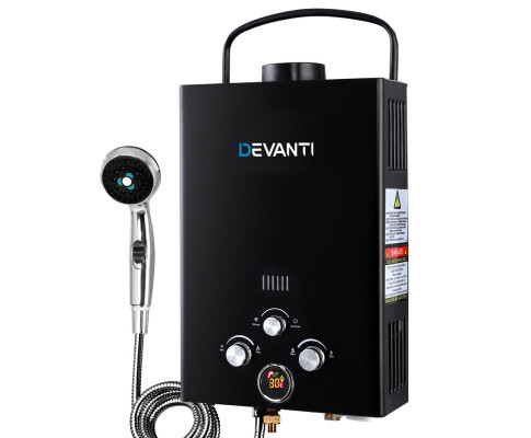 Devanti Black Portable Gas Water Heater, 1 Year Warranty.