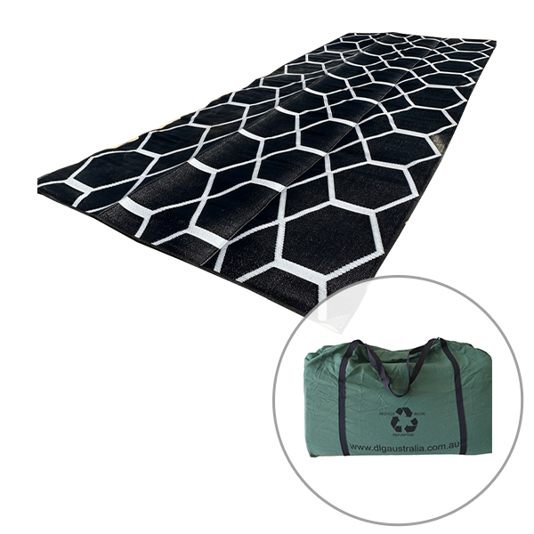 DLG Australia 240 x 540 cm Recycled Mat, Black/Light Grey with Bag, 1 Year Warranty. Introducing the Recycled Caravan Mat, crafted from 100% recycled materials, including locally sourced materials right here in Australia, this mat is a testament to the commitment to the environment. These mats are sand-free, dirt-free, waterproof, and UV treated. The unbeatable prices and Aussie-owned textile recycling background make us the best on the market.
