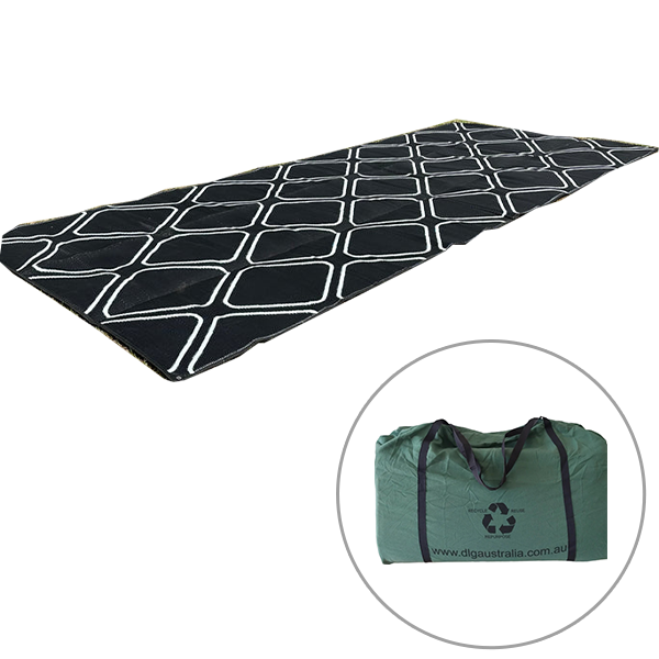 DLG Australia 240 x 600 cm Recycled Mat, Black/Light Grey with Bag, 1 Year Warranty. Introducing the Recycled Caravan Mat, crafted from 100% recycled materials, including locally sourced materials right here in Australia, this mat is a testament to the commitment to the environment. These mats are sand-free, dirt-free, waterproof, and UV treated. The unbeatable prices and Aussie-owned textile recycling background make us the best on the market.