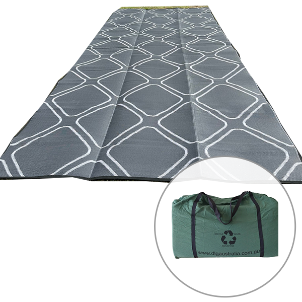 DLG Australia 240 x 600 cm Recycled Mat, Two Tone Grey with Bag, 1 Year Warranty. Introducing the Recycled Caravan Mat, crafted from 100% recycled materials, including locally sourced materials right here in Australia, this mat is a testament to the commitment to the environment. These mats are sand-free, dirt-free, waterproof, and UV treated. The unbeatable prices and Aussie-owned textile recycling background make us the best on the market.