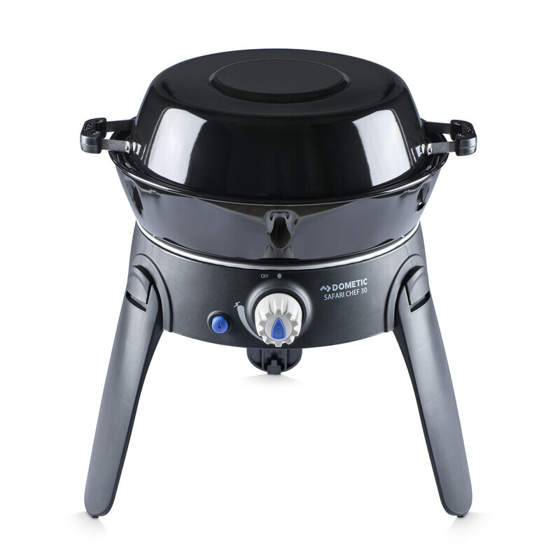 Dometic Cadac Safari Chef 30 Portable Gas BBQ, 2 Year Warranty. This compact and lightweight barbeque weighs just 4.7kg and comes with four different cooking surfaces. The removable fat pan catches cooking residues, but at the same time acts as a windshield to protect the Safari Chef’s burner. The barbeque comes with a convenient carry back for easy transportation. The Safari Chef 30 works with a hose and pressure regulator. This is an ideal barbeque for use at the campsite, on the balcony or in the park.