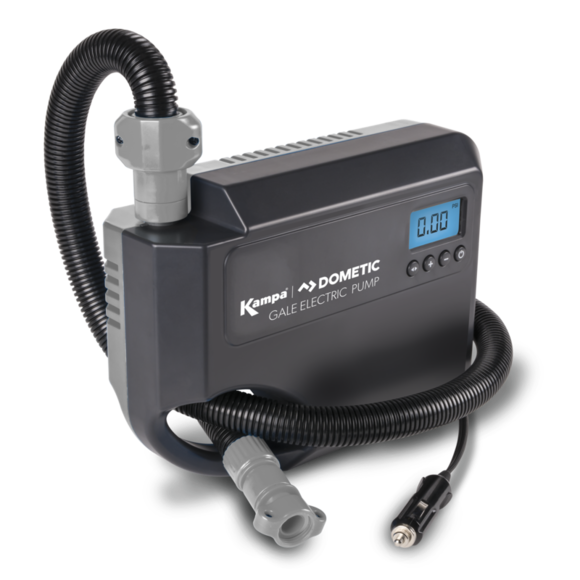 Dometic Gale 12V Electric Pump, 1 Year Warranty. This 12 V electric pump is designed specifically for use with Dometic AIR awnings and tents. Simply plug into a 12 V power source using the extra-long cable and set the required PSI.