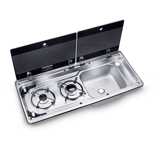 Dometic MO9722 2 Burner Combination Stove with Sink, 3 Years Warranty. Cook and clean with ease using this two-burner gas stove and sink combo for RVs. The durable safety glass lids offer protection and double as convenient workspace.