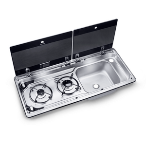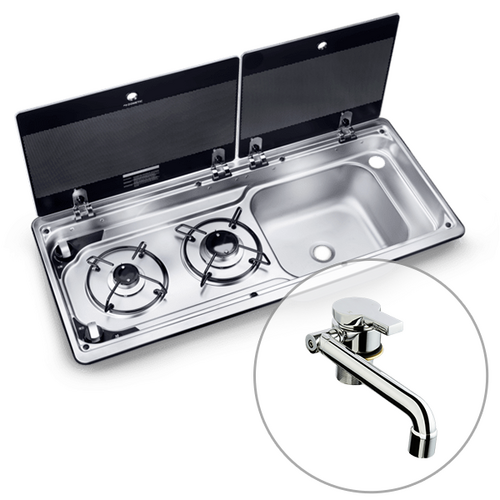 Dometic MO9722 2 Burner Combination Stove with Sink and Hot & Cold Tap, 3 Years Warranty. Want more from your caravan kitchen? The Dometic MO9722 gives you two burners, a sink, and a low-profile tap — all in one sleek unit. Compact, stylish and super practical, it’s a must-have for easy cooking on the road in your camper trailer, caravan or motorhome kitchen. A two-burner gas stove and sink combination unit for RVs. It comes complete with durable safety glass lids that simultaneously provide protection and extra workspace when the unit is not in use.