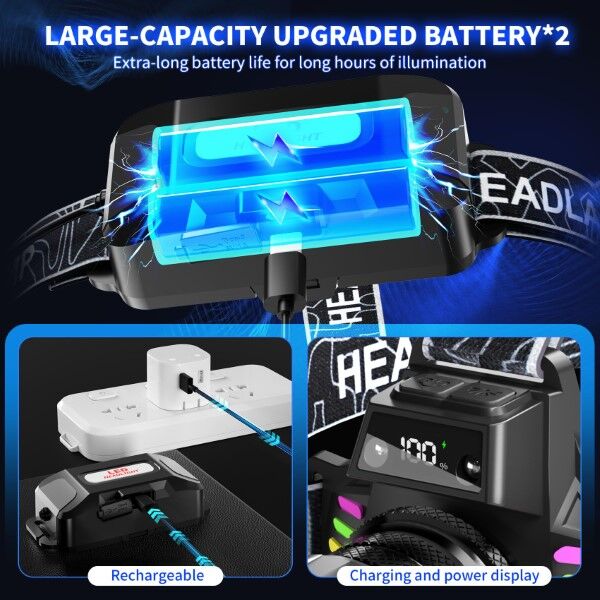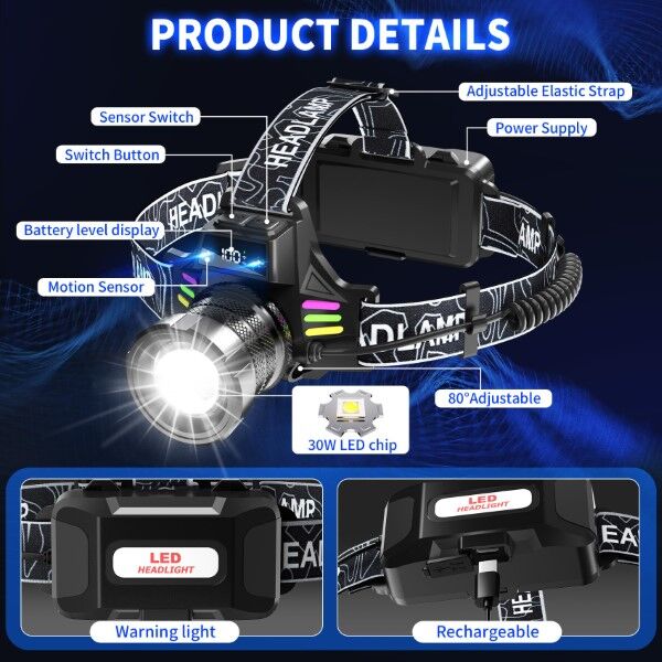 DZ LED Headlamp with Digital Display & Motion Sensor, 1 Year Warranty. Illuminate your night adventures with this powerful LED headlamp designed for outdoor enthusiasts. Whether you're hiking through the bush, fishing at dawn, running on forest trails, or setting up camp under the stars, this high-performance headlamp delivers a bright, focused beam that reaches up to 1800 metersperfect for navigating dark terrain with confidence. Powered by a 30W LED chip and advanced optical design, it produces up to 3500 lumens of crisp white light, ensuring clear visibility even in complete darkness. The built-in motion sensor allows hands-free operationsimply wave your hand to turn the light on or off, ideal when carrying gear or working with both hands. A digital LCD screen displays real-time battery level so you can monitor usage and avoid unexpected shutdowns. With seven lighting modes including high, low, flash, SOS, and two red warning lights, it adapts to any situationfrom emergency alerts to preserving night vision. The zoomable lens lets you switch between wide floodlight and long-distance spotlight, while the 80 adjustable head angle ensures optimal positioning. Fully rechargeable via USB-C, it supports fast charging and offers up to 24 hours of runtime on low mode. Durable, lightweight, and IPX7 waterproof, its built to withstand rain, sweat, and rugged conditionsmaking it your essential companion for every outdoor journey.