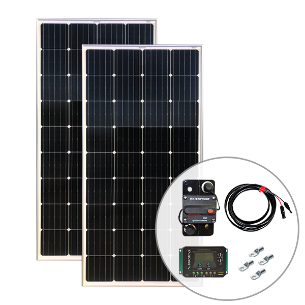 Enerdrive 2 x 190W Solar Panel Kit, includes Solar Charge Controller, Circuit Breaker, 10m Solar Cable & Lugs, 5 Year Warranty.