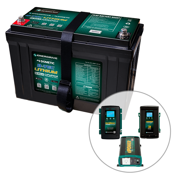 Enerdrive B-TEC 100Ah Lithium Battery, Charger & Inverter Bundle, 5 Year Warranty. Power up your adventures with the ultimate energy solution bundle featuring top-of-the-line components from Enerdrive. The Enerdrive B-TEC 100Ah Lithium Battery, paired with the robust 40A DC to DC Battery Charger and your choice of the efficient 20A or 40A AC Battery Charger, ensures seamless charging performance wherever your journey takes you. But that's not all – this bundle also includes the reliable Enerdrive ePOWER 1000W Pure Sine Wave Inverter, providing you with versatile AC power output for a range of applications.