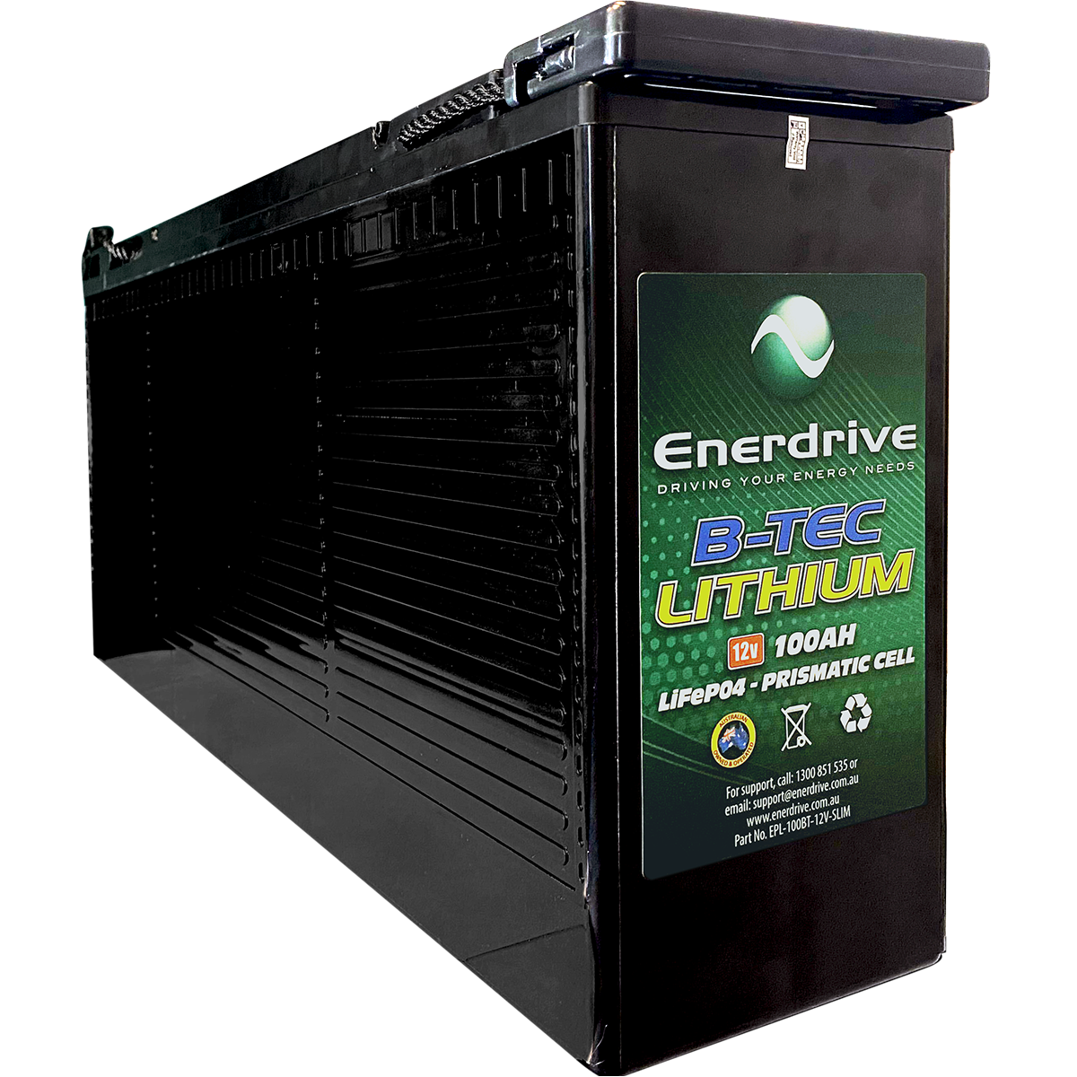 Enerdrive B-TEC 100Ah Slimline Lithium Battery, 5 Year Warranty. Enerdrive B-Tec 100AH Slim Battery is an ideal solution for those who are limited for space. It can be well positioned behind the back seat of most dual cab utes or narrow spaces in other locations. The limited edition B-Tec 100Ah Slim Lithium has the same DNA boasts as all other Enerdrive B-Tec batteries. With high quality prismatic cells and suitable for up to 1000 Watt inverter with the best aftersales support program in Australia.