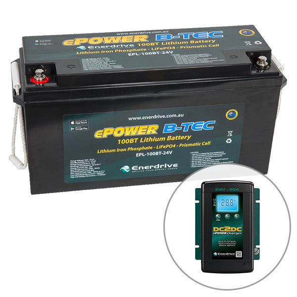 Enerdrive B-TEC 24V 100Ah Lithium Battery & 24V 30A DC2DC Charger Bundle, 5 Year Warranty. Introducing the Enerdrive B-TEC 24V 100Ah Lithium Battery & 24V 30A DC2DC Charger Bundle, a powerhouse combination engineered to provide reliable and efficient power solutions for your diverse energy needs. This bundle comprises the innovative Enerdrive B-TEC 24V 100Ah Lithium Battery and the robust Enerdrive ePOWER 24V 30A DC to DC Battery Charger, offering unparalleled performance and convenience for your applications.