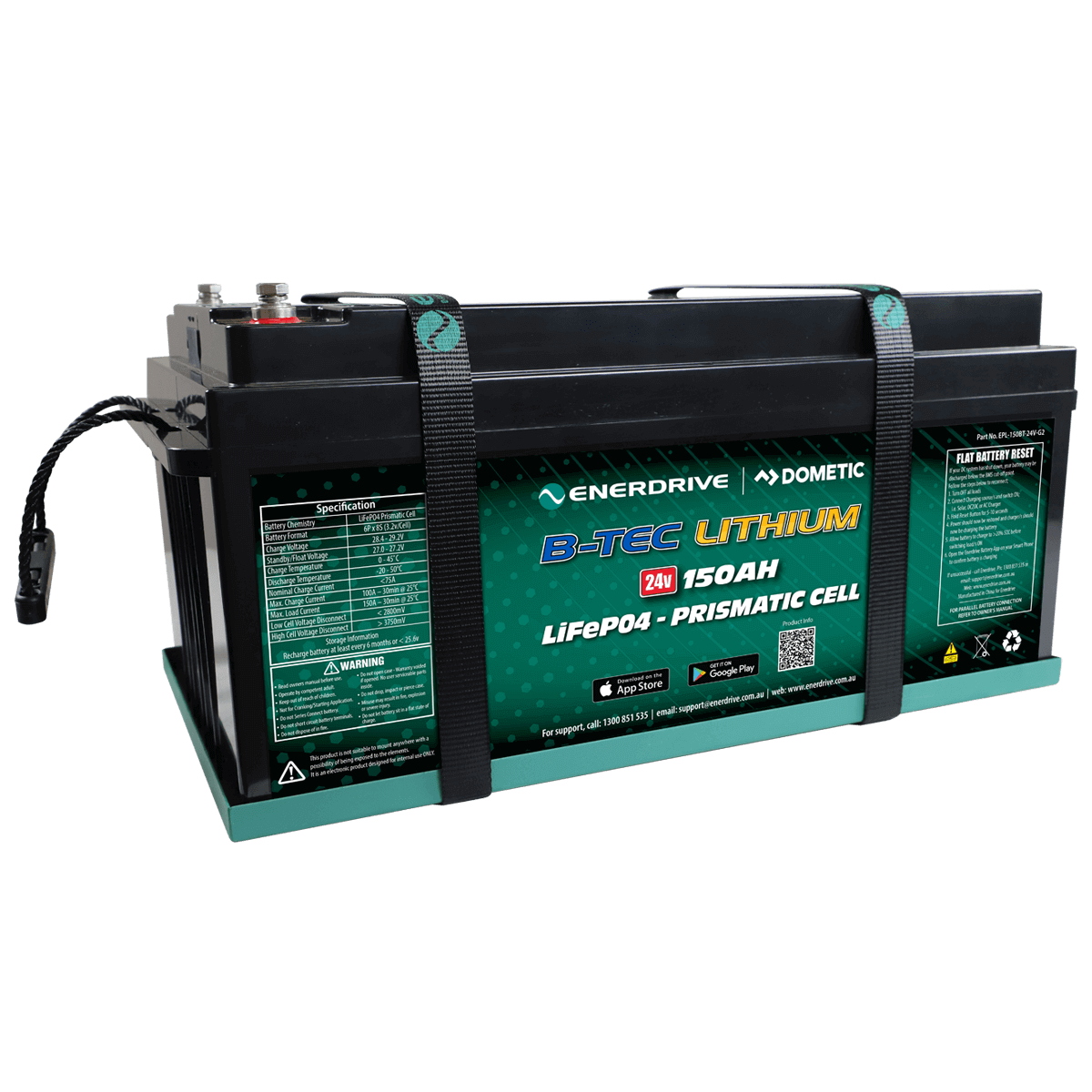 Enerdrive B-TEC 24V 150Ah Lithium Battery, 5 Years Warranty. Available in 12v 100Ah, 125Ah, 200Ah and 300Ah capacities and 24v 150Ah & 36v 100Ah, the ePOWER B-TEC lithium battery is designed and intended for use in deep cycle applications where a single battery is required that meets the amp hour capacity.