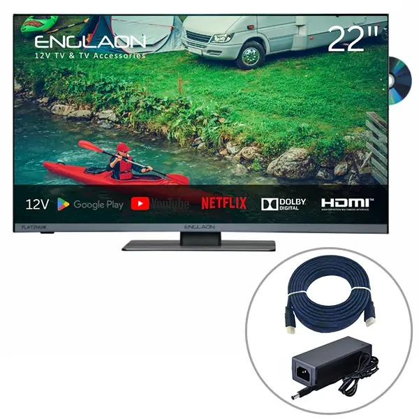 Englaon 22" Frameless Full HD Google Smart 12V TV With Built-in DVD player & Chromecast, 1 Year Warranty.The ENGLAON LED22X80 builds on the popular 22” television size by adding a range of features & functionality. Shipping with Chromecast, Dolby sound, and a large FHD screen, the 22X80 is a perfect companion for entertainment on the go.