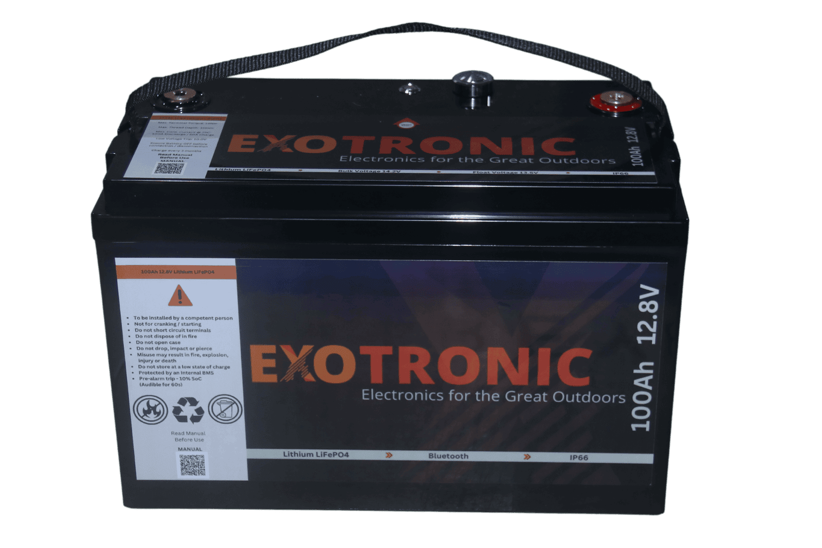 Exotronic 12V 100Ah Smart Bluetooth Lithium Battery, 5 Year Warranty. Exotronic Lithium Batteries are perfect for Caravan/RVs, 4x4s, Marine, backup power and many other applications.The battery has been vibration tested and is machine sealed for reliable waterproofing. Making this battery particularly suitable for off-road and marine applications and those wanting extra reliability.