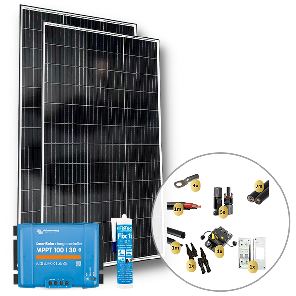 Exotronic 2 x 180W Solar Panel with Victron SmartSolar MPPT 100/30 Charge Controller & Wiring Kit, 5 Year Warranty.