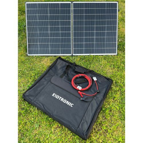 Exotronic 200W Portable Folding Solar Panel, 5 Year Warranty. When camping, parking under shade, or need access to free power to charge your battery, Exotronic has you covered with a strong but small form-factor foldable glass solar panel solution. The 200W briefcase is made up from two 100W solar modules using Trina half-cut 23% PERC monocrystalline solar cells with 9-wire busbars to maximise module efficiency.