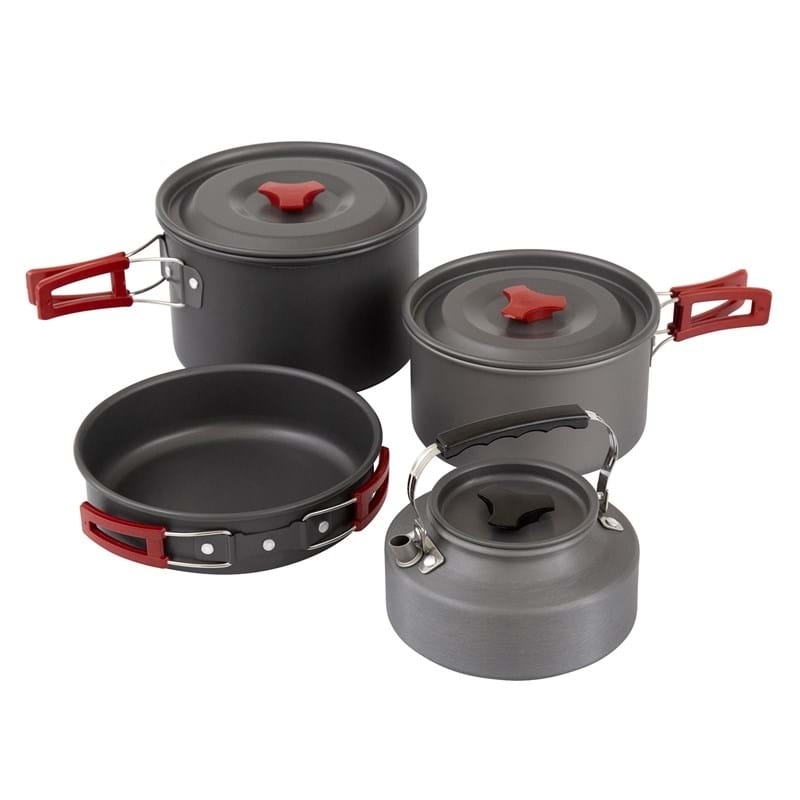 Explore Planet Earth Aluminium 4 Piece Cookware Set, 1 Year Warranty. Cook up a storm when camping with the Explore Planet Earth Aluminium Cookware Set. Featuring corrosion resistant aluminium construction with folding cool touch handles. Comes with a carry bag for easy storage and transport.