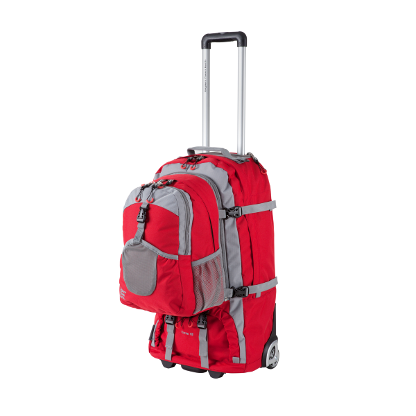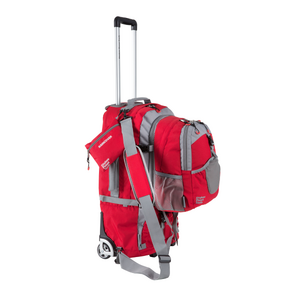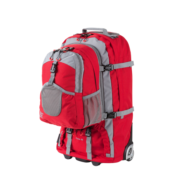 Explore Planet Earth Red Cursa Adventure Roller Bag, 65L, 2 Years Warranty. Roll to the far corners of the Earth with the Cursa Roller bags; and when the going gets too tough for wheels, the padded harness will let you shoulder your load with ease. The Cursa provides you with the best of both worlds and comes with a host of features for an endless amount of storage options. Large zippered opening for easy packing, a detachable daypack and loads of other features make this stylish and medium sized roller bag a winner where versatility and carrying options are required.