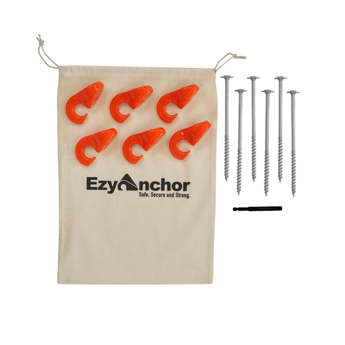 The Ezy Anchors are made from durable recyclable plastic with the screw pegs being positioned at an approximate 30 degree angle. This provides greater resistance in the ground when under load, whilst the signature Ezy Anchor hook shape stops guy lines being released in any weather conditions.