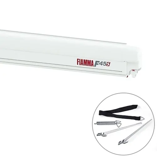 Fiamma F45 S Awning Polar White 3.0m Royal Grey, 1 Year Warranty. The easy-to-use and simple-to-install awning joins today's best technologies, service, and quality. The F45s awning is compact and functional, making it the best choice for your holidays! When not in use the F45s takes up little space while snuggly enclosed in its aluminium case. It is sturdy and safe to operate with an easy-to-hook winch loop. UV resistant, waterproof, washable, Privacy room option available.