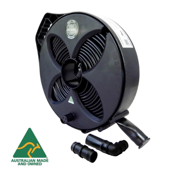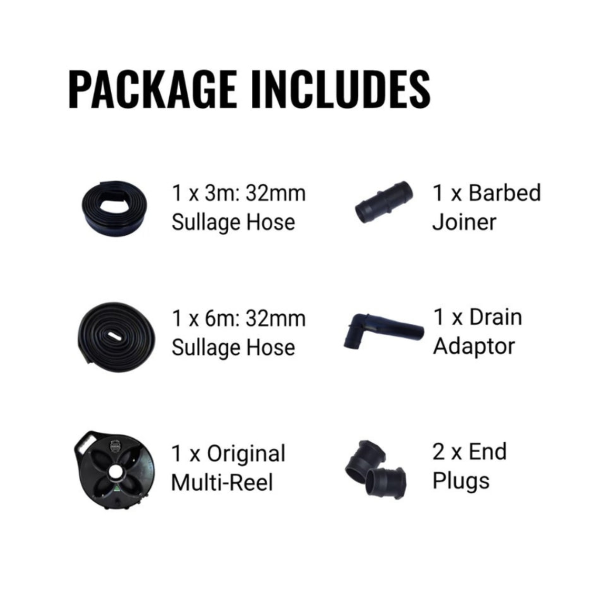 Flat Out 6M Sullage Hose on Black Multi Reel, 32mm, 1 Year Warranty. This is our highest flow sullage hose, when configured correctly it's flow rate is easily capable of handling a washing machine plumbed driectly.