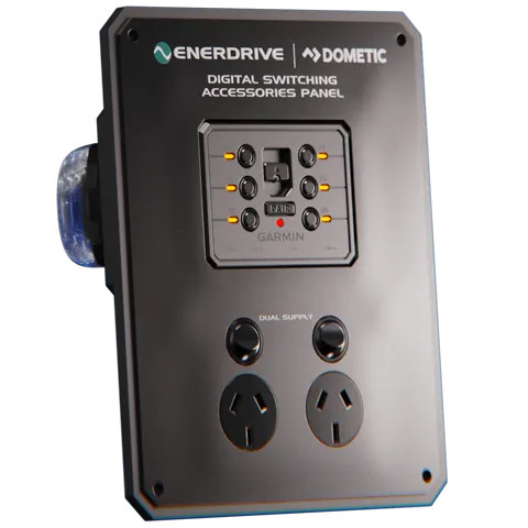 Garmin Digital Switching Panel W175 X H215mm with GPO, 5 Year Warranty. Enerdrive | Dometic is proud to present our new Digital Switching Accessories Panel (DSAP) range. We’ve built a number of solutions to grant you access to digital switching, battery monitoring and common accessory outlets – all on the one panel. With multiple solutions available to suit different sizes and applications, the DSAP range is flexible enough to cater for all kinds of installations.