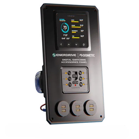 Garmin Digital Switching Panel W175 X H280mm (12V Sockets & Simarine Cutouts), 5 Year Warranty. Enerdrive | Dometic is proud to present our new Digital Switching Accessories Panel (DSAP) range. We’ve built a number of solutions to grant you access to digital switching, battery monitoring and common accessory outlets – all on the one panel. With multiple solutions available to suit different sizes and applications, the DSAP range is flexible enough to cater for all kinds of installations.
