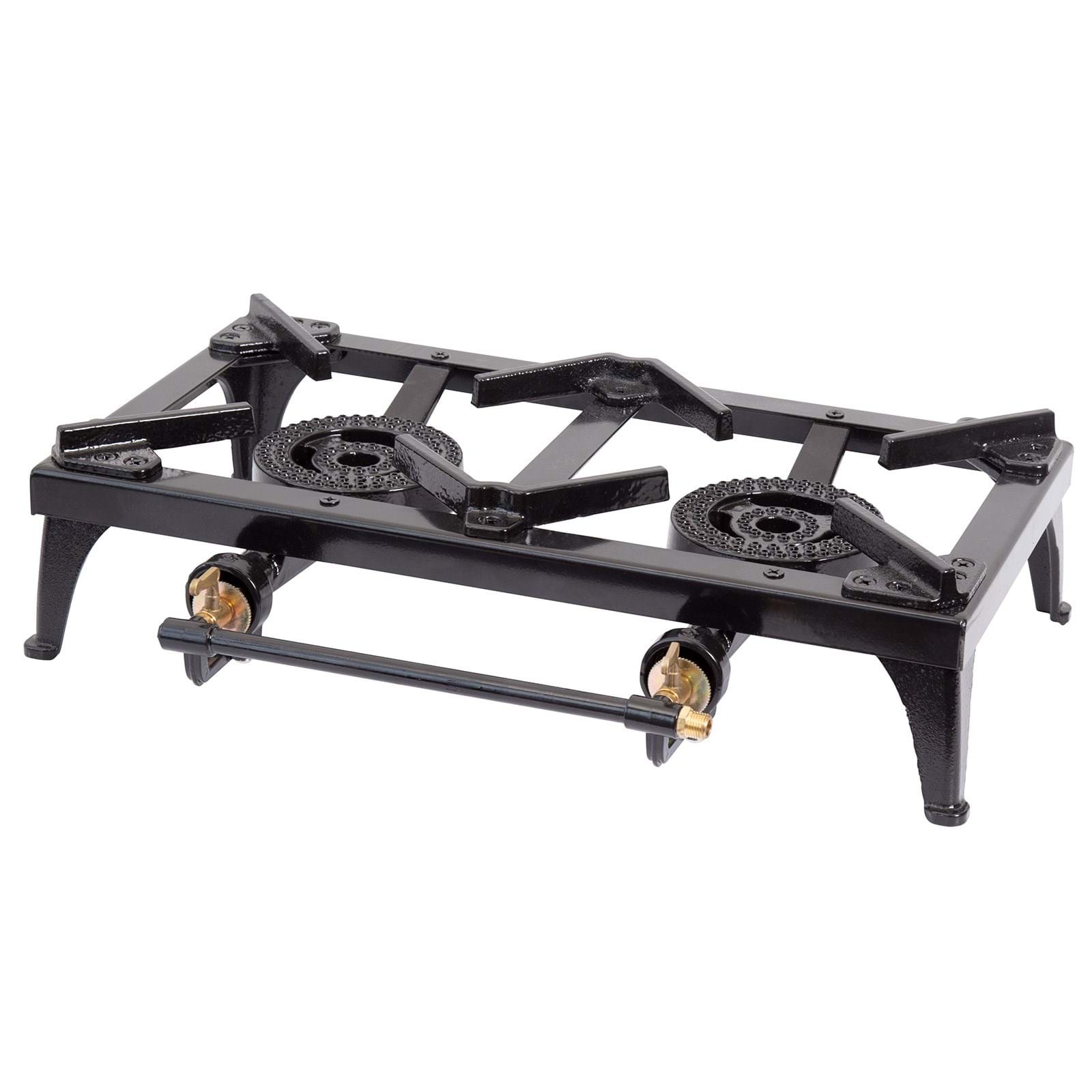 Gasmate Cast Iron Twin Burner Country Cooker, 1 Year Warranty. The Gasmate Cast Iron Double Burner Country Cooker is ideal for your next camping adventure with its sturdy and durable cast iron frame. Easy to use fine controls and powerful high heat output makes for effortless cooking. The Cast Iron Double Burner Country Cooker comes complete with hose and regulator.