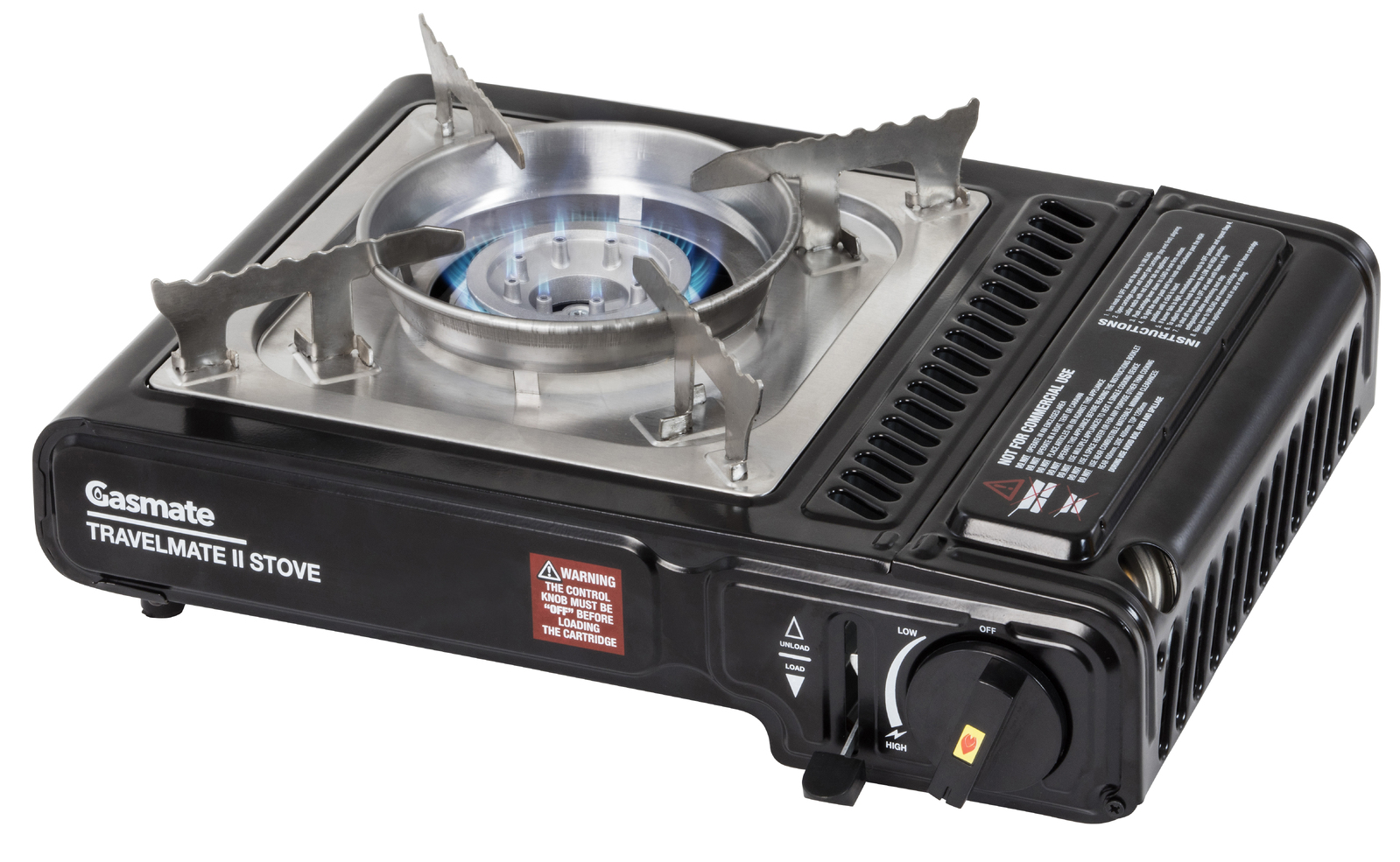 Gasmate Travelmate II Single Black Butane Stove with Stainless Steel Spill Tray, 1 Year Warranty. The Gasmate Travelmate II Stove is an economical, highly efficient outdoor butane gas cooking stove. With twin over-pressure sensing devices - enhanced safety devices which sense if pressure becomes too high. If over-pressure occurs the cartridge is ejected or gas supply is shut off to the burner.