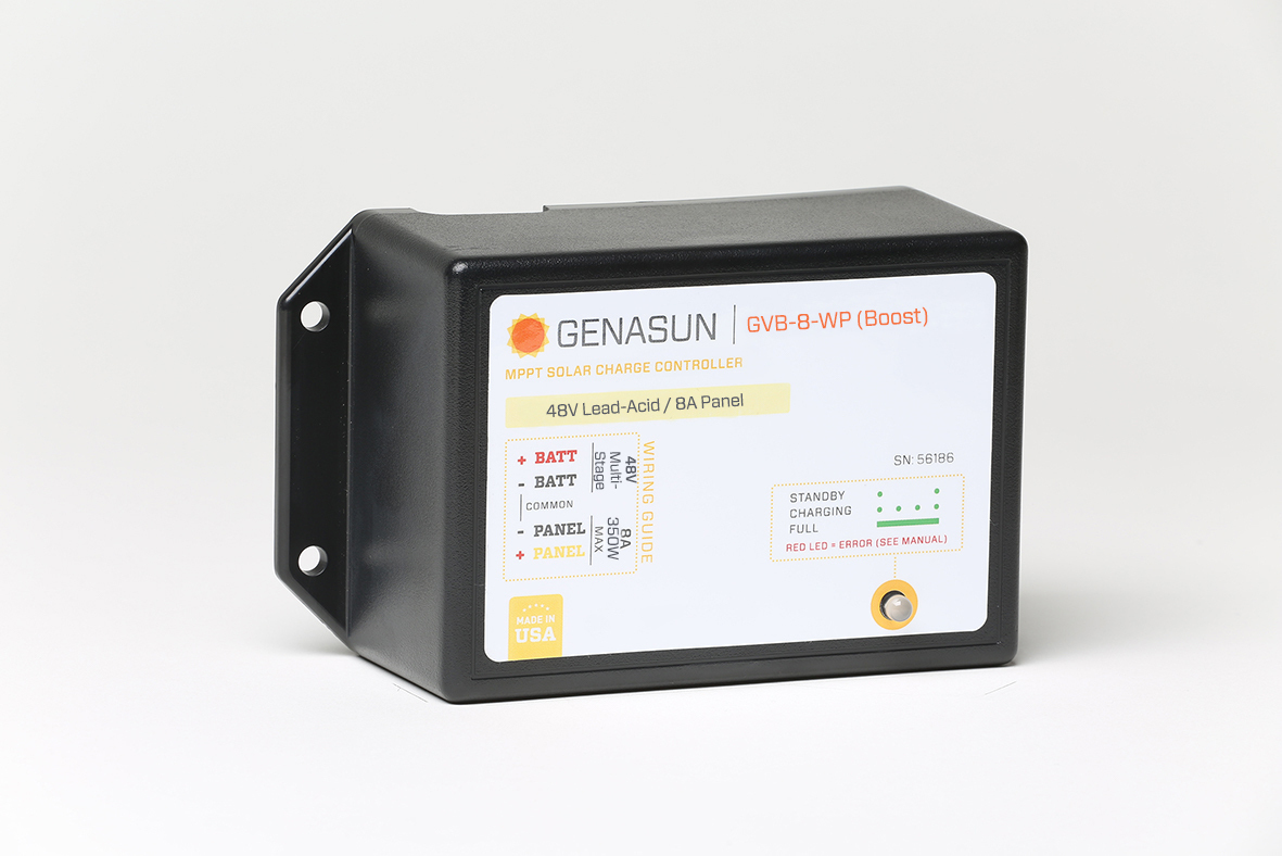 Genasun MPPT 8A Lithium Solar Charge Controller, Waterproof Voltage Boost, 5 Year Warranty. Get your money’s worth with Genasun. A true problem-solver, the unique GVB charge controller with MPPT allows a lower-voltage solar panel to charge higher-voltage batteries.