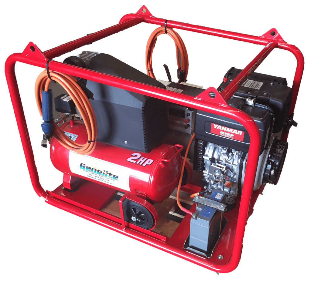 Genelite 6.5kVA 3 in 1 Diesel Welder Generator Workstation, powered by Yanmar, 2 Year Warranty. Genelite diesel generators are backed by a comprehensive 2 year warranty and national service agent and spare parts support. Built tough with sturdy roll over frames, these units will provide portable power solutions for many, many years to come and are able to be enhanced with optional accessories if required, including wheel kits, weatherproof outlets and over-sized alternators.