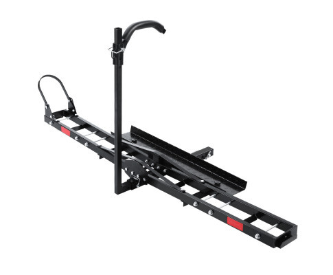 Giantz Motorcycle Carrier with Vertical Arm - 2" Hitch Mount, 1 Year Warranty. Transport your motorcycle with confidence with the Giantz Motorcycle Carrier. With its 2'' hitch mount, the carrier is compatible with most hitch receivers. Featuring heavy-duty steel construction, the carrier can carry up to 227kg (500lbs) with minimum hassle. It is also designed to enable steady and firm transport with a close-fitting front tyre channel, anti-tilt holder and front wheel chock. Both the tilt-holder and front wheel chock can be adjusted with three available positions. The loading ramp also enables easy up and down and be used either side. Not least, the carrier can also be used for cars with their tyres backed up onto the carrier.