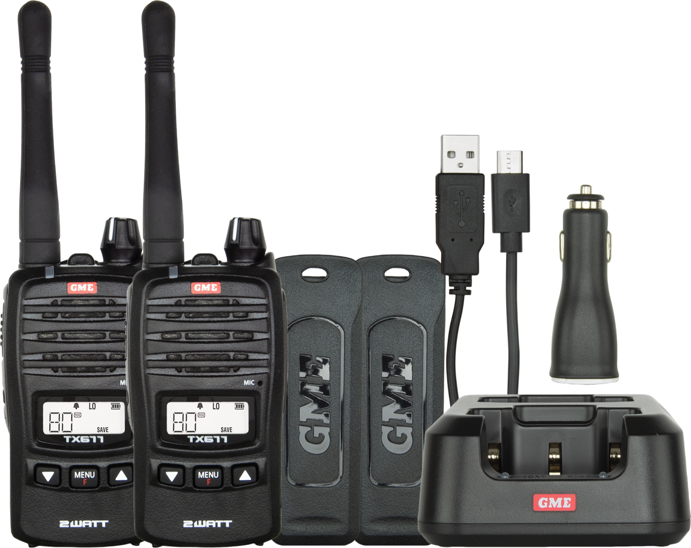 The TX677TP includes two TX677 radios, a convenient twin desktop charger, AC adaptor, and a 12V DC vehicle charger.