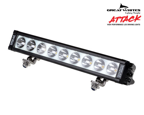 Great Whites 9 LED Attack Driving Light Bar, 3 Year Warranty. Attack the night with market leading technology from Great Whites. The Great Whites Attack range out performs the Gen2 range of equivalent size, is lighter and built to last anything you or the Australian environment can throw at it.
