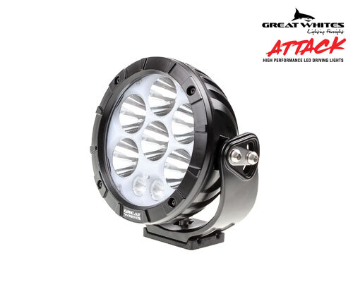 Great Whites Attack 170 Series Round LED Driving Light, 3 Year Warranty. Attack the night with market leading technology from Great Whites. The Great Whites Attack range out performs the Gen2 range of equivalent size, is lighter and built to last anything you or the Australian environment can throw at it.