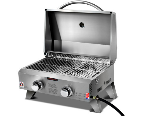 Grillz Portable 2 Burner Gas BBQ, 1 Year Warranty. The portable gas BBQ features two 304 stainless steel 10,000BTU burners and food-grade 430 stainless steel for the body and hood. It has a double-layer lid with latch and fastener and large front carry handle. The legs are retractable for easy transport and the BBQ utilises a piezo-equipped ignition control knob with an integrated thermostat. A stainless steel grease collection tray ensures easy cleaning.