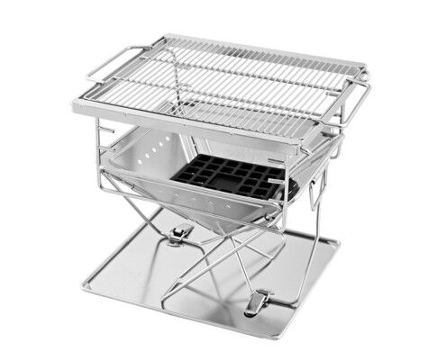 Grillz Portable Stainless Steel Camping Fire Pit & BBQ, 1 Year Warranty. With our Grillz Portable Fire Pit BBQ, you can expect some genuine all-season enjoyment all round. First, as a fire pit, it is simply great sitting around a nice warm fire with friends and family to chat the day or night away. And should you decide to up the ante and have a sumptuous BBQ instead, just load on the food for some great feastings. Both the body and grill parts are made of food-grade stainless steel, meaning they are completely safe for cooking, and strong and durable too. There is also a fastener for connecting the legs to the bottom tray for stability and safety. The grill rack is large and height-adjustable so that you can cater to large groups and always have the perfect amount of heat for whatever is cooking. And for a consistent good fire, the fire pit BBQ is designed with ample ventilation to let air flow through easily. Best of all, it folds flat for easy storage and transportation so that you can set it up on your lawn, deck and patio or even in caravan parks and camping sites. A bonus carry bag is also included for effortless, one-handed carrying. So all you need to do now is light up some wood or charcoal fire and get cosy for a great time around the fire pit.
