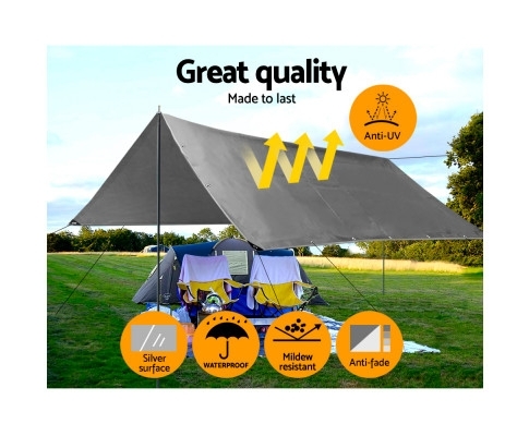 Instahut 6x9M Heavy Duty Camping Cover Tarp - 180GSM Silver, 1 Year Warranty. Are you tired of having the bottom of your tent always wet with every camping trip? Or does the rain rot your firewood? Or do you need some reliable cover for your vehicle or craft? Or maybe just a little shade for yourself. Look no further than our Instahut Poly Tarp. The answer to all your covering challenges and more.