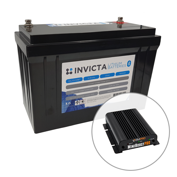 Invicta 12V 125Ah Lithium Battery with Bluetooth + BMPRO 30A 12V DC to DC Battery Charger with Solar Input, 7 Year Warranty